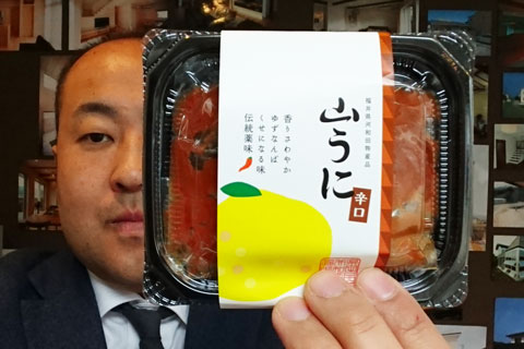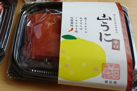 山うにとは、ゆず、鷹の爪、赤なんば(完熟ししとう)、塩を練り込んだ鯖江市河和田の伝統的な薬味です。うにに似てるから山うにというそうです。