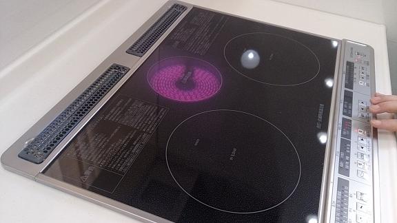 このピンク(赤く)なっているところがラジエントヒーターです。3口ともIHになっているものもあれば、一つだけ電熱線で熱くなるラジエントヒーターが入っているタイプのものもあります。このラジエントヒーターはふつーに熱くなるので、網を置いて焼けばふつうに焼けます。