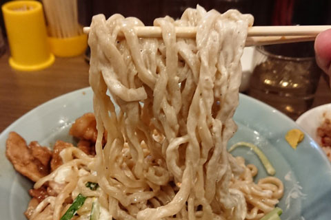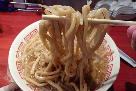 ズドンと登場したこの冷やされた麺。そのおかげでコシがあり、豪快にすすりたくなります。味はというと想像通りジャンキーでうまい。