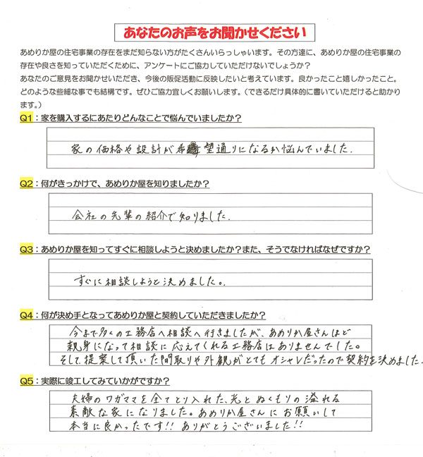 今まで多くの工務店へ相談へ行きましたが、あめりか屋さんほど親身になって相談に応えてくれる工務店はありませんでした。そして提案して頂いた間取りや外観がとてもオシャレだったので契約を決めました。