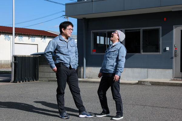 現場管理のスタッフも上下アイボリーのゆったりした作業着でしたが、今後はブルーのブルゾンに、ズボンもスリムなものを選んでスッキリ着こなせるものを選びました。
