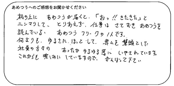 机の上にあめつうが届くと「おっ!!きたきた」とニンマリして、とりあえず仕事はさておき、あめつうを読んでいるあめつうフリークの1人です。