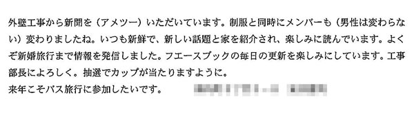 いつも新鮮で、新しい話題と家を紹介され、楽しみに読んでいます。よくぞ新婚旅行まで情報を発信しました。フェースブックの毎日の更新を楽しみにしています。浩二部長によろしく。抽選でカップが当たりますように。