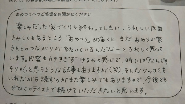 楽しみだった家づくりも終わってしまい、うれしい反面さみしくもあるところ「あめつう」が届くと、まだあめりか屋さんとのつながりが続いているんだなーとうれしく思っています。