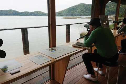 ↑三方五湖の一つ「三方湖」を望遠鏡で望むぼくです。