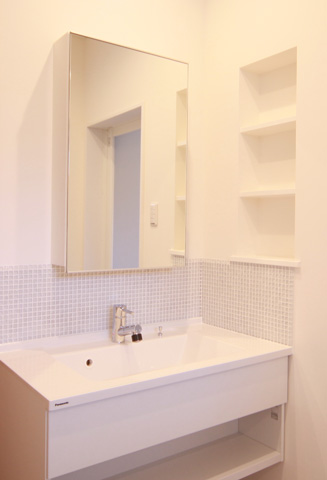 鏡の右側にニッチがついていて、歯ブラシなど置いておくのにちょうどいい収納となりました。