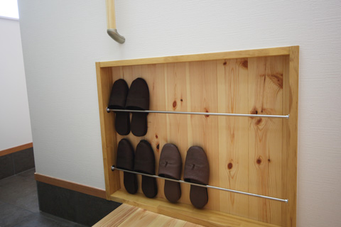 スリッパの厚み的にちょうどいいくぼみとなって、こんな収納もできたりするんですね~。