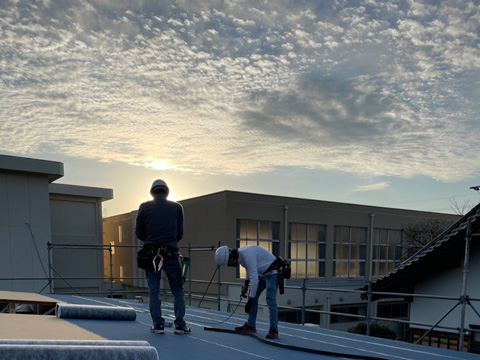 そして夕方には目標としていた、屋根じまいと外壁シージングボード張りまで完成。さすが腕のいい職人さんたちです。