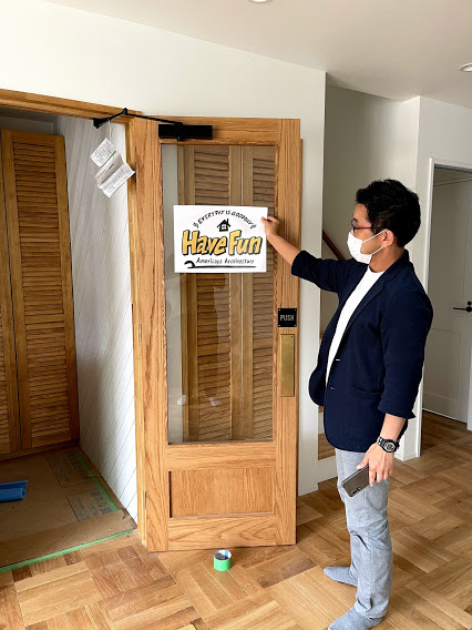 そしてあめりか屋が得意とする造作リビングドアにテキストロゴを貼るシュミレーションをしている写真です。