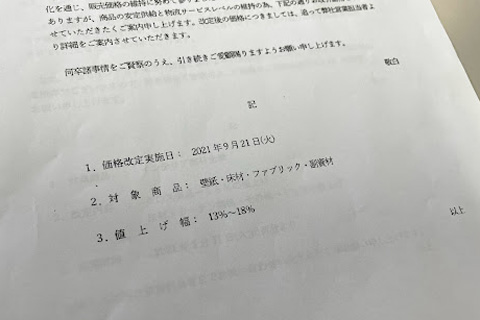 昨日も某内装メーカーから値上げしますっていうFAXが届きました。涙