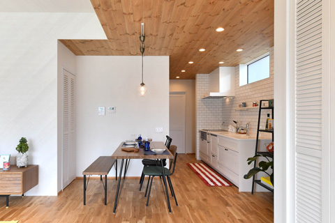 対面キッチンであれば最も多いかたちです。キッチンが見えることもありませんし、配膳もひかくてきしやすいですね。