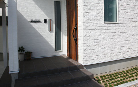 ↑あめりか屋でもこのようにタイル貼りの玄関の方が多いです。施工事例『笑顔が集まる白い家』(敦賀市砂流の注文住宅)