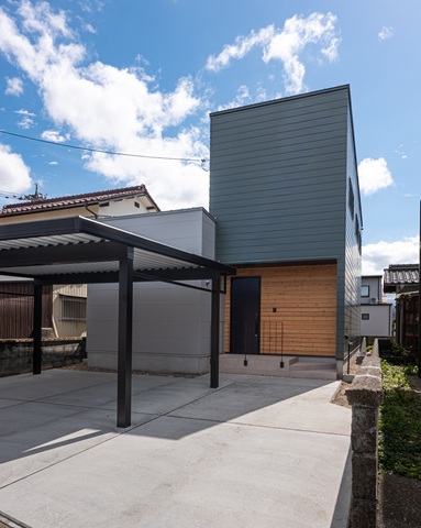 ガルバ(IG工業SPビレクト)、木(福杉クリア塗装)、シンプルなサイディング(ルビドフラット)のコンビネーションでスタイリッシュな外観となりました。