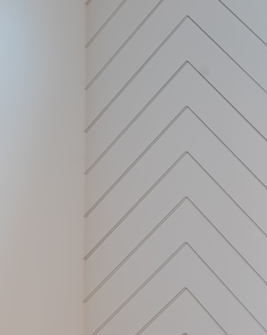 リビングの壁はシェブロン張りの造形美。