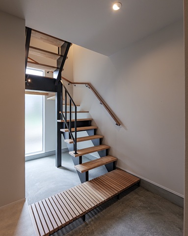 玄関に入ると広めの玄関で、スケルトン階段と大きな窓で明るい空間に。木のおしゃれスノコもいいですね~。