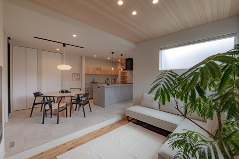 LDKはL型で18帖。リビングを奥に配置してダウンリビングとしたことでなんとなく居心地のいいリビングに。