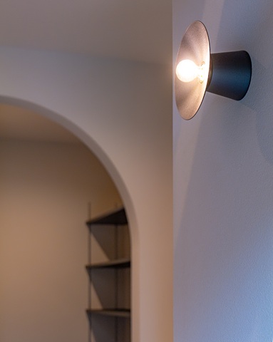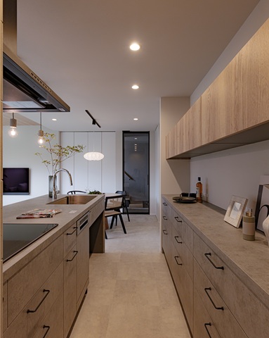 ダイニングキッチンは、床をビニル床タイル、キッチンはグラフテクト、ハイドア、そしておかわな照明を採用することで、こんなにいい感じにまとまりました。