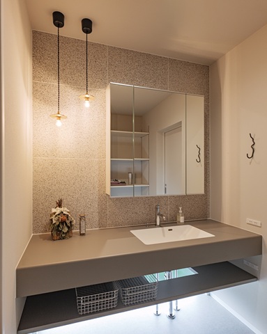 洗面スペースは広め(W1650)でシンプルで美しく、下部の地窓のオリジナリティをプラス。