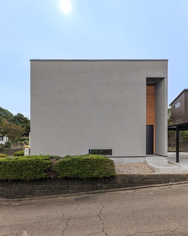 正面BOX型のグレーの塗り壁とエントランスの板張りが印象的な外観です。