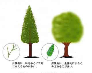 葉が針のように尖っているものを針葉樹(杉・松・ヒノキなど)。丸いかたちの葉のものを広葉樹(さくら、ナラ、ケヤキなど)。かんたんに言うと針葉樹は見た目がとんがってて、広葉樹は丸い感じです。