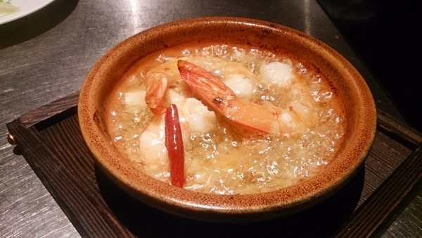 天使の海老とマッシュルームのアヒージョ(アヒージョってニンニクをオリーブオイルで煮たやつ)