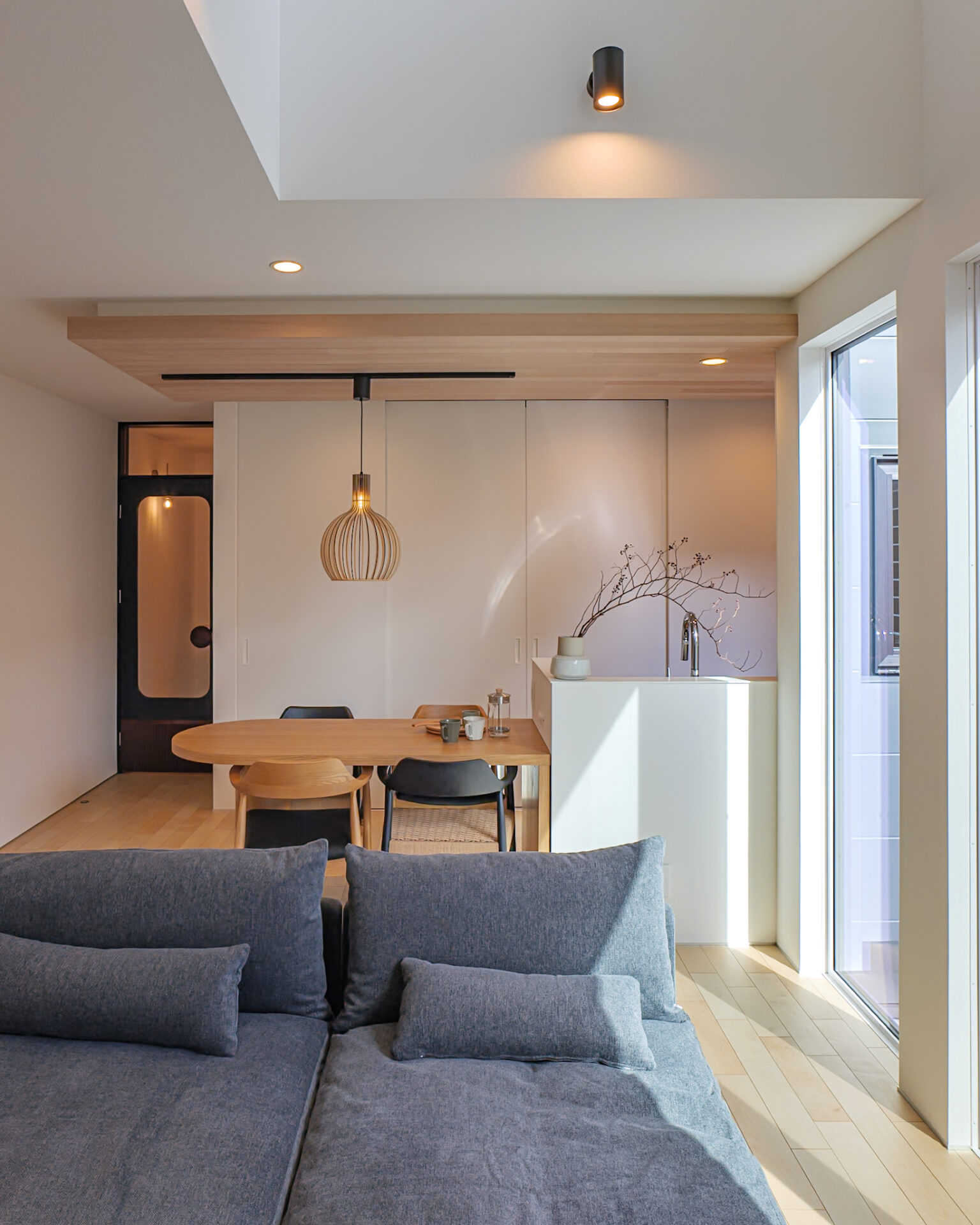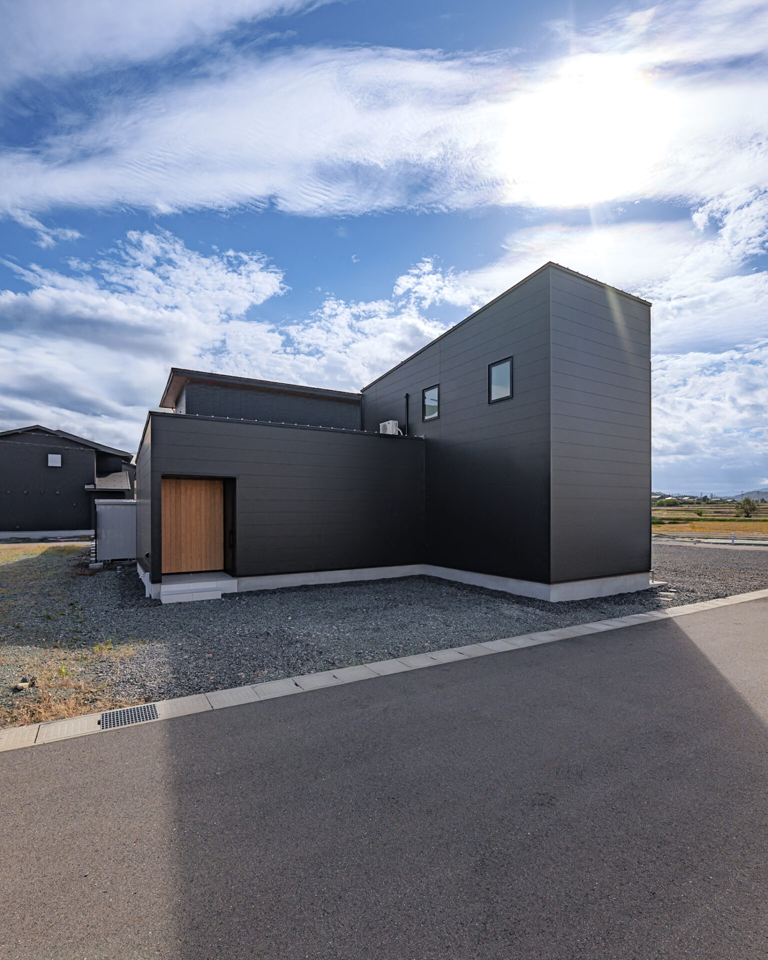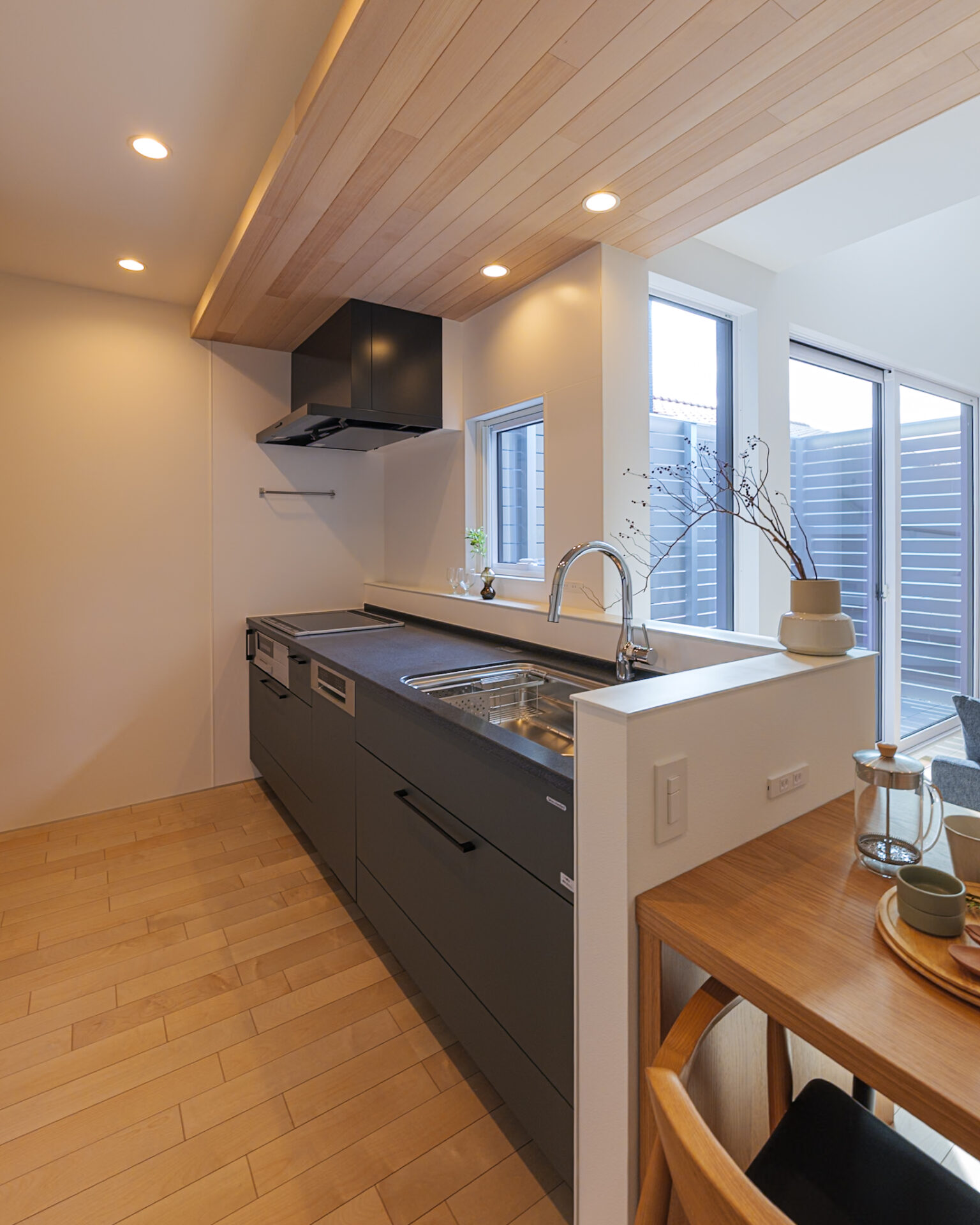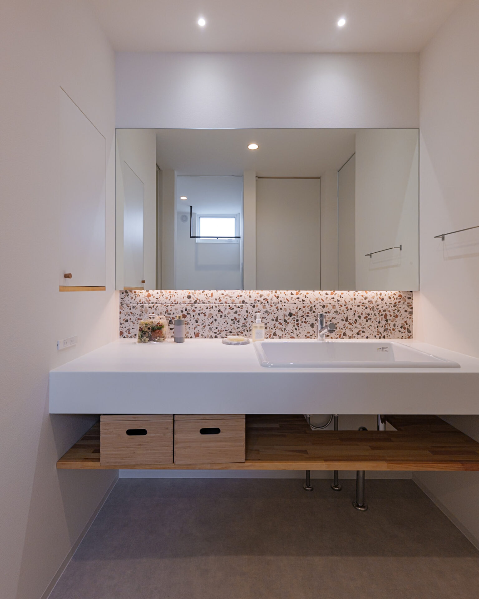 シンプルノートのコンセプト「正面に窓をつけない」外観で、ガルバ(IG工業:ガルブライト)がシンプルでモダンな印象です。LDKはL字で中庭を囲むように配置。階段下スペースはスタディースペースに。洗面は人気のワイド型(W1650)で間接照明を配置したことで、グッと上質な雰囲気に。