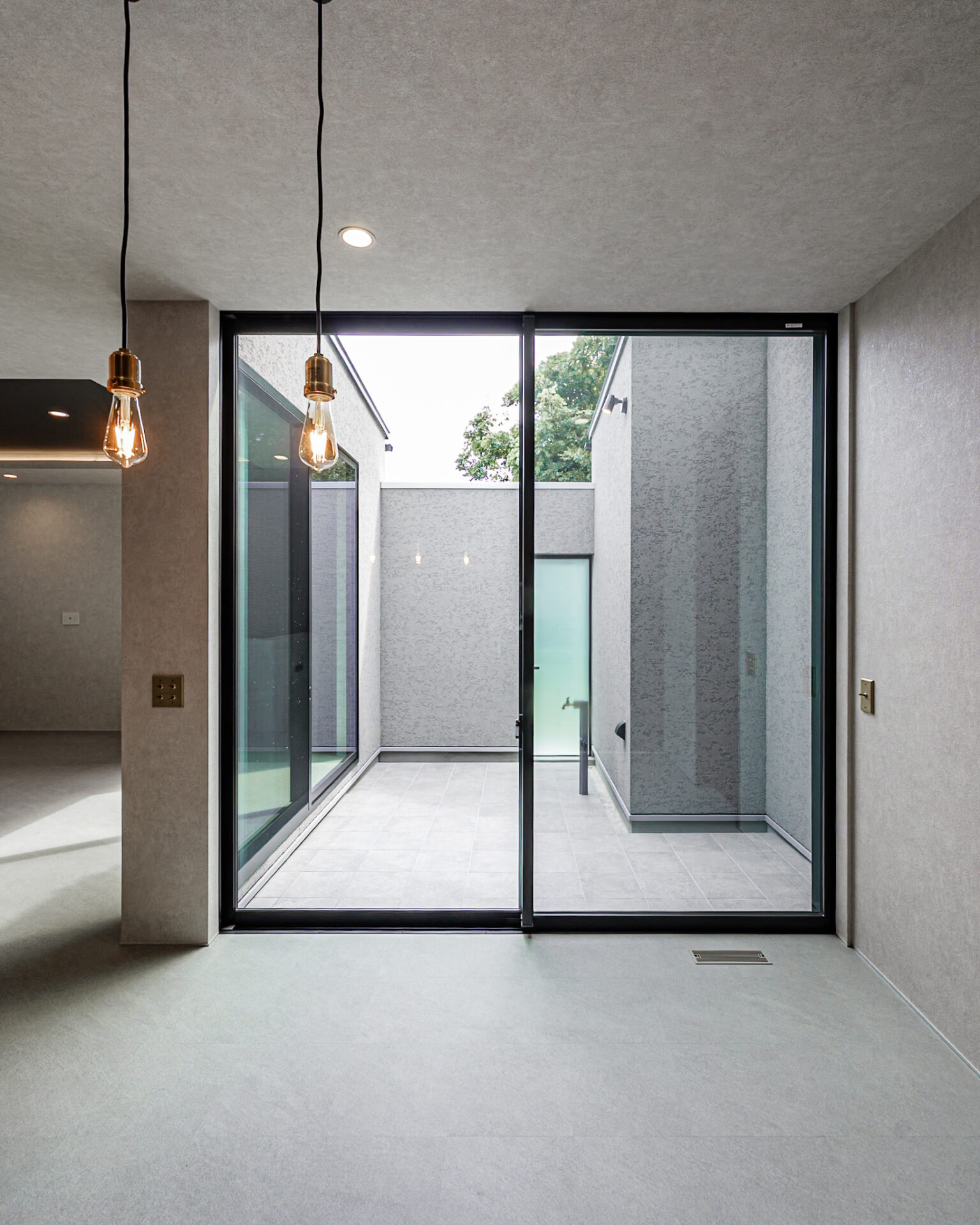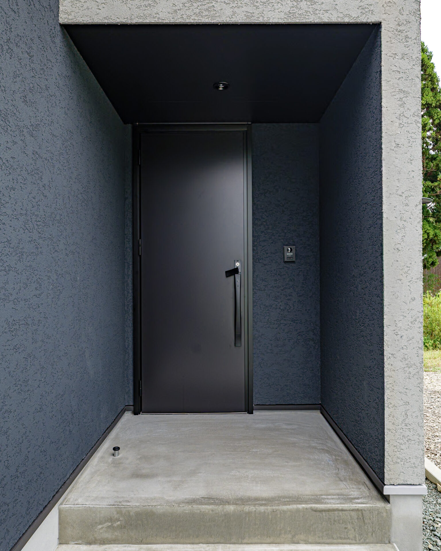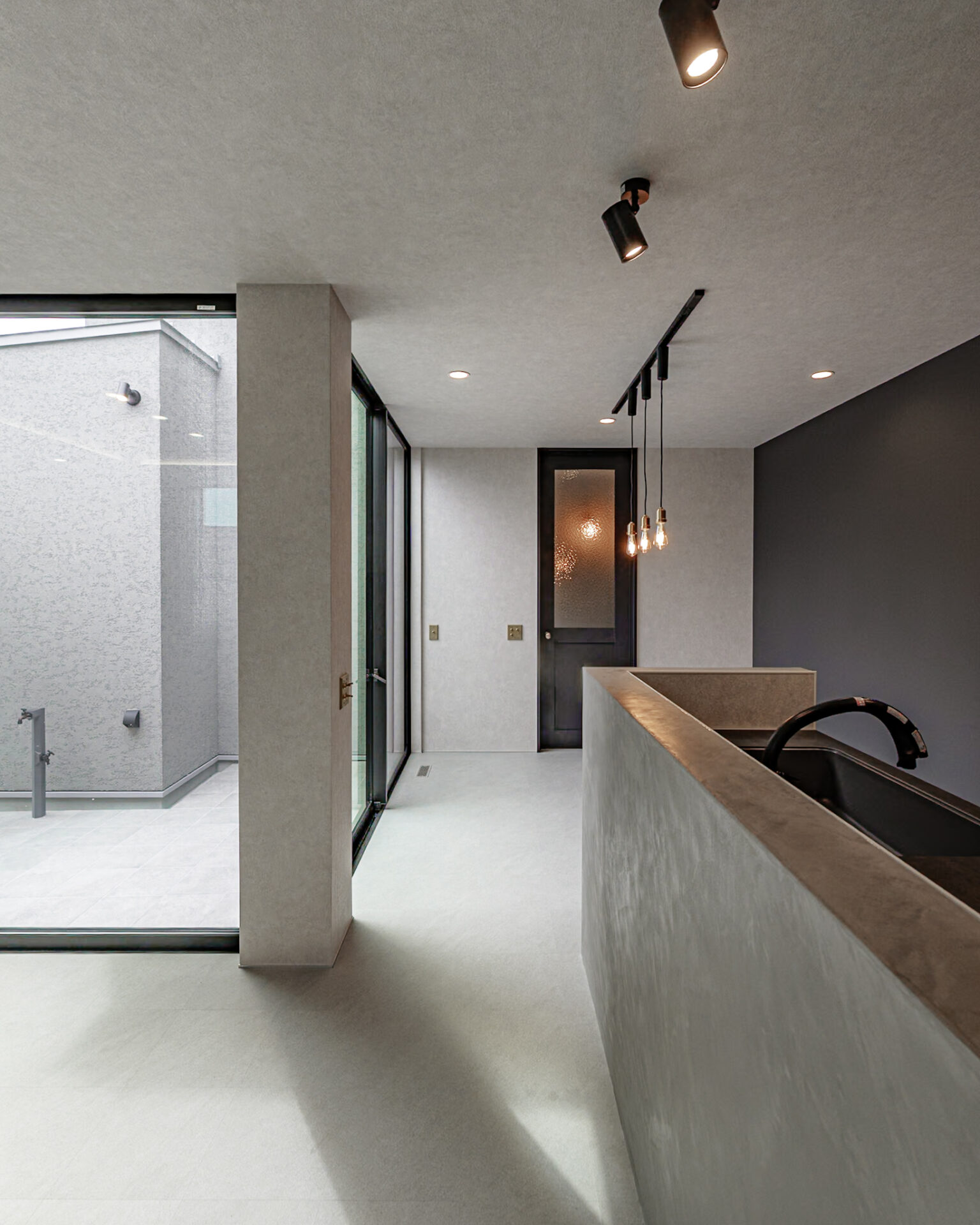 シンプルノートで正面に窓のない四角い形状のデザイン。箱が並んでいるように見えるシンプルデザインです。全面塗り壁で美しい仕上がりです。エントランスも木目のないグレーなモダンな配色。フェンスではなく、壁で中庭を囲っているので立地条件も手伝って「完全カーテンレスで過ごせる」状態となっています。キッチンカウンターはみなさま大好き!モールテックスです。中庭もタイルデッキということでメンテナンス的にも楽ちんです。