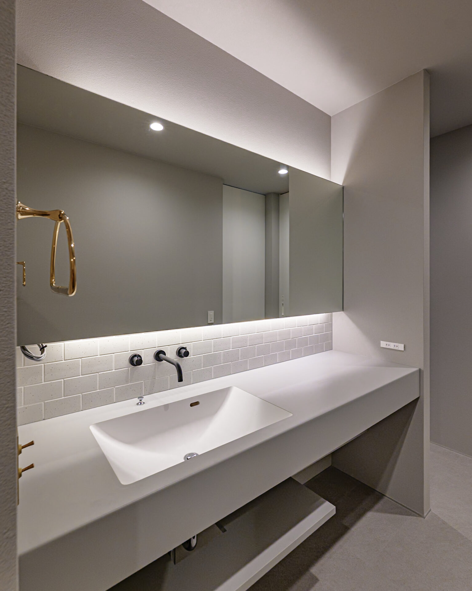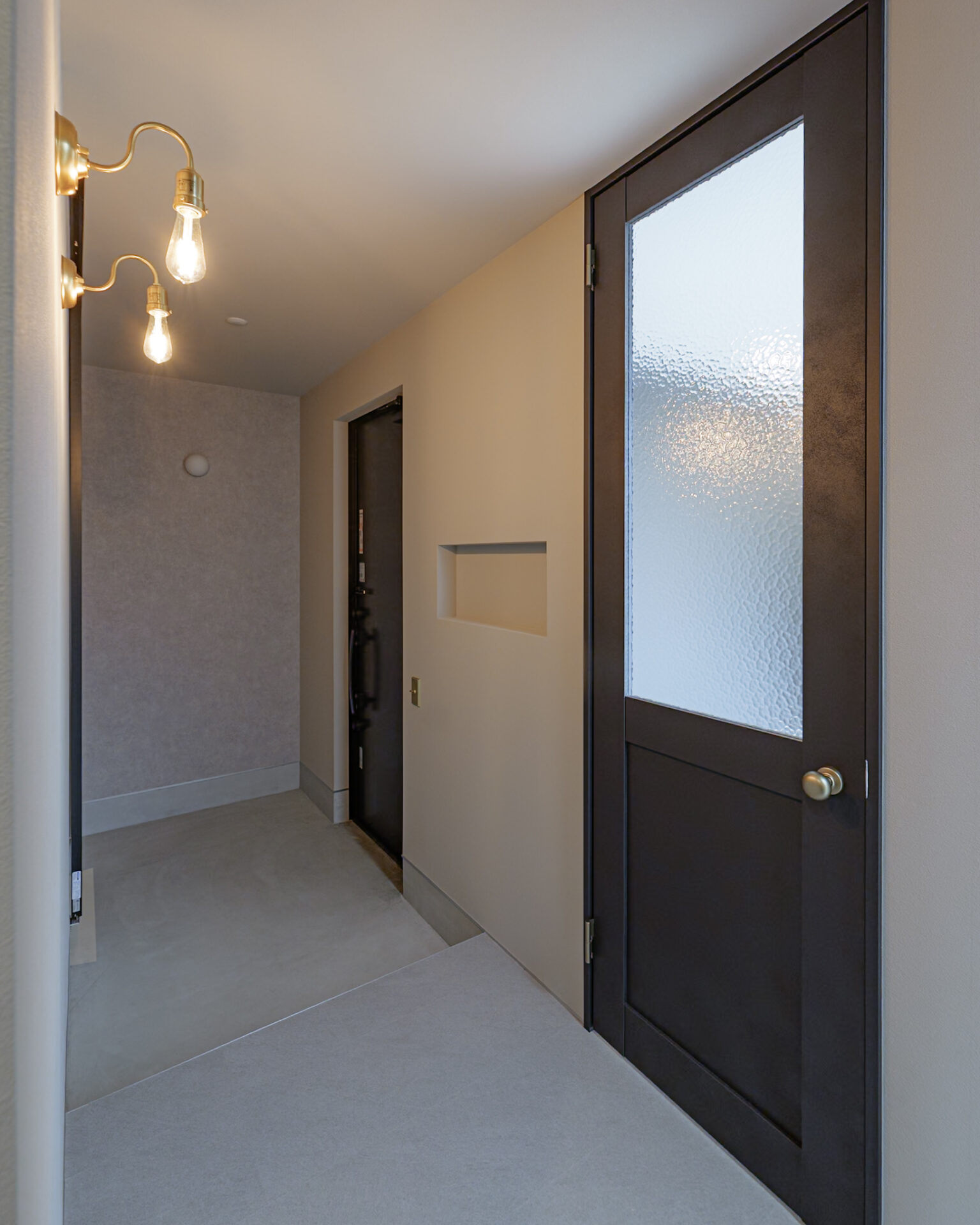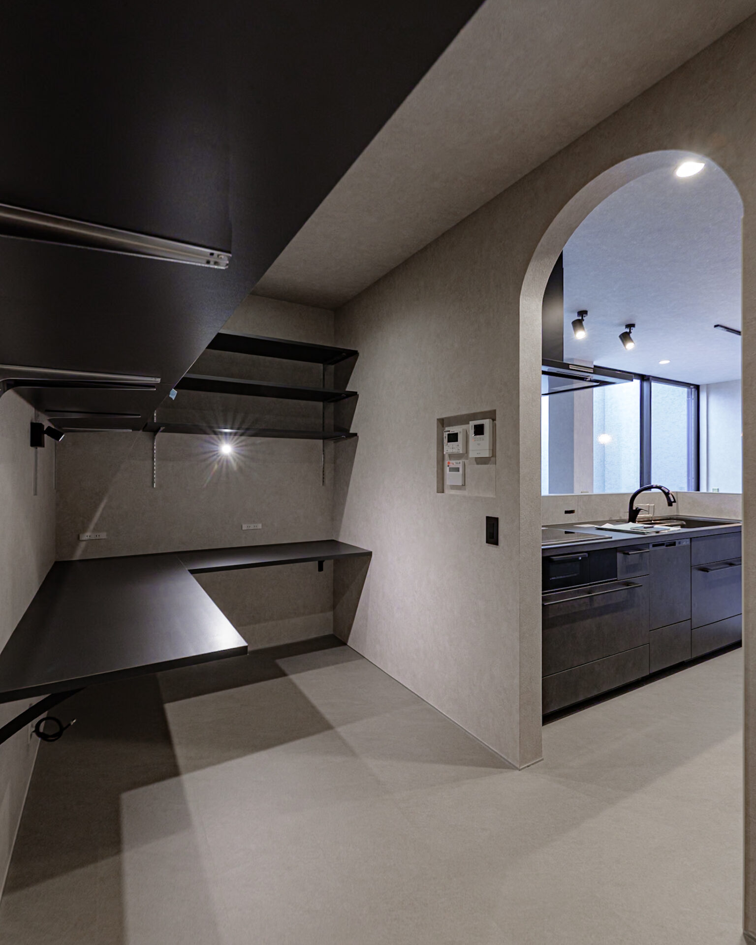シンプルノートで正面に窓のない四角い形状のデザイン。箱が並んでいるように見えるシンプルデザインです。全面塗り壁で美しい仕上がりです。エントランスも木目のないグレーなモダンな配色。フェンスではなく、壁で中庭を囲っているので立地条件も手伝って「完全カーテンレスで過ごせる」状態となっています。キッチンカウンターはみなさま大好き!モールテックスです。中庭もタイルデッキということでメンテナンス的にも楽ちんです。