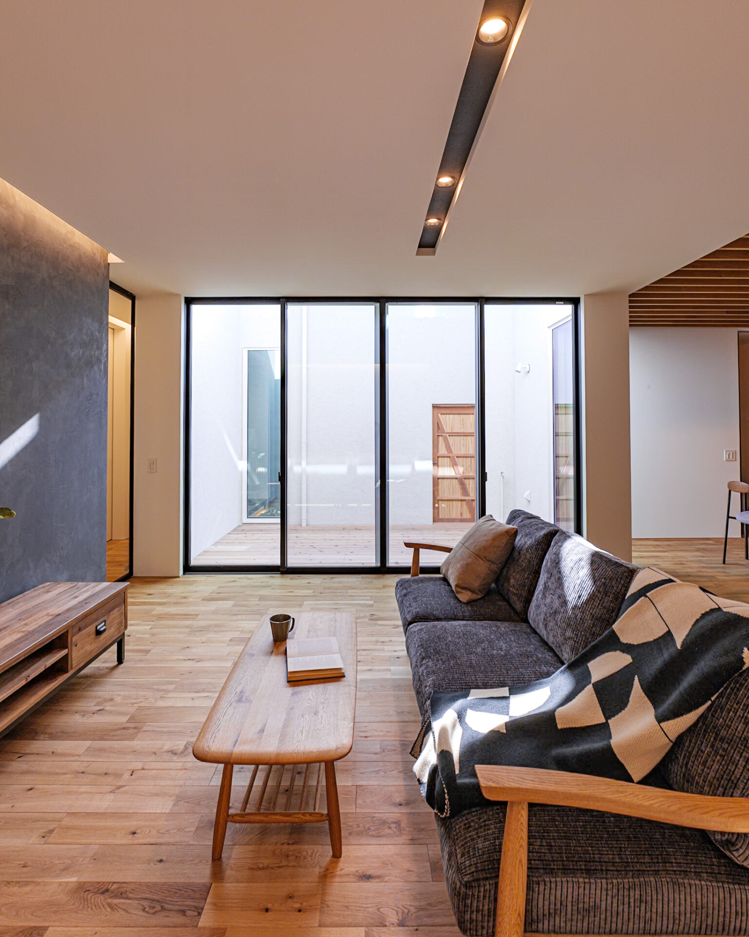 シンプルノートのコンセプト「正面に窓をつけない」外観で、ブラックの塗り壁がシンプルでモダンな印象です。窓は中庭面に大きな窓を配置していてカーテンレスで暮らせるほどの解放感。LDKはとても広くそれでいて中庭との連続性もとれています。洗面台はモールテックスを使った上質な空間に。